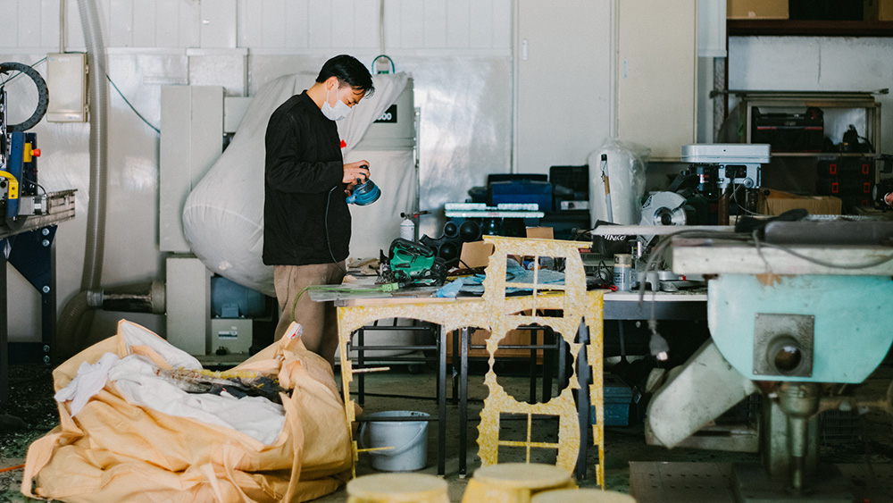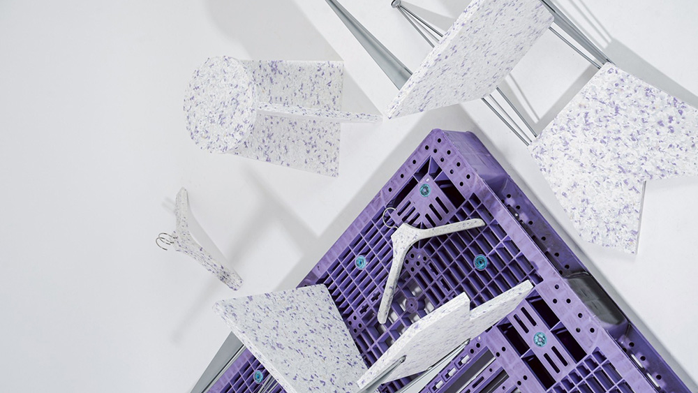 REMAREがつくる100%リサイクルプラスチック「Shinju」をベースに、POETRYがREMAREの工場まで足を運び、役目を終えた工業用パレットをセレクト&再編集しました。