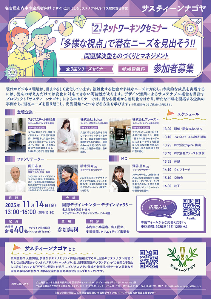 ※サスティーンナゴヤ ネットワーキングセミナーは、サステナブル経営への関心深化・デザイン経営の理解・交流を目的とした全3回のシリーズセミナーです。第2回からでもご参加いただけます。
