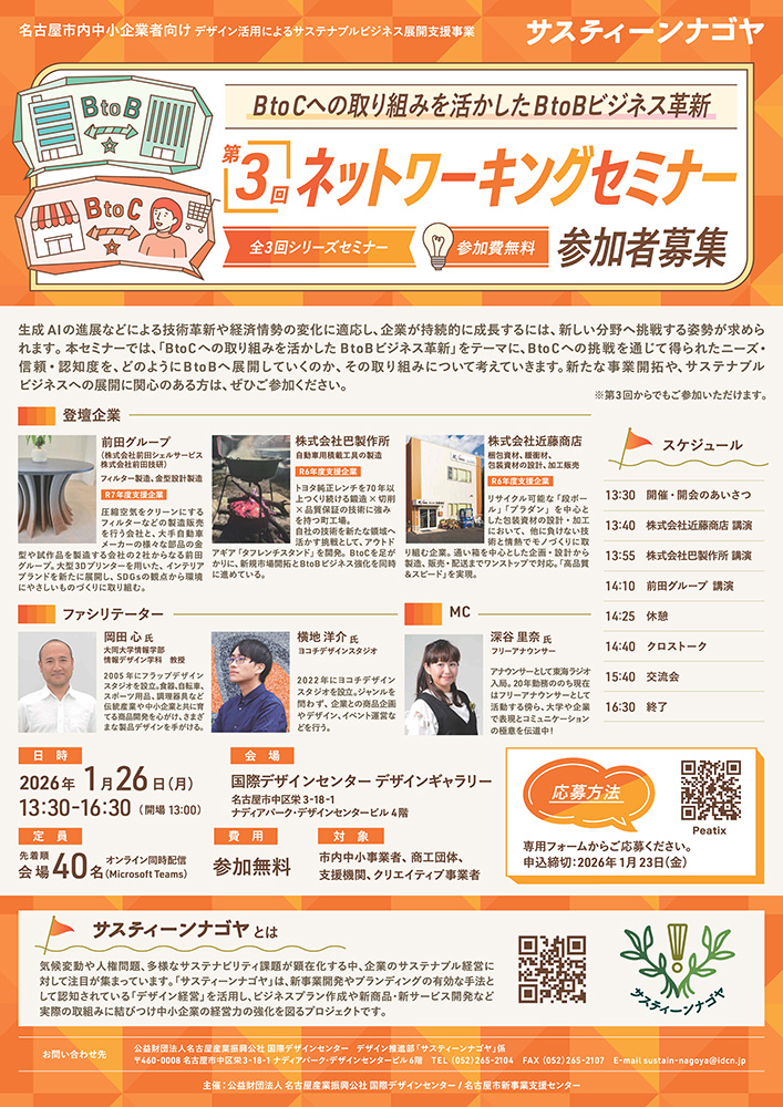 ※サスティーンナゴヤ ネットワーキングセミナーは、サステナブル経営への関心深化・デザイン経営の理解・交流を目的とした全3回のシリーズセミナーです。第3回からでもご参加いただけます。